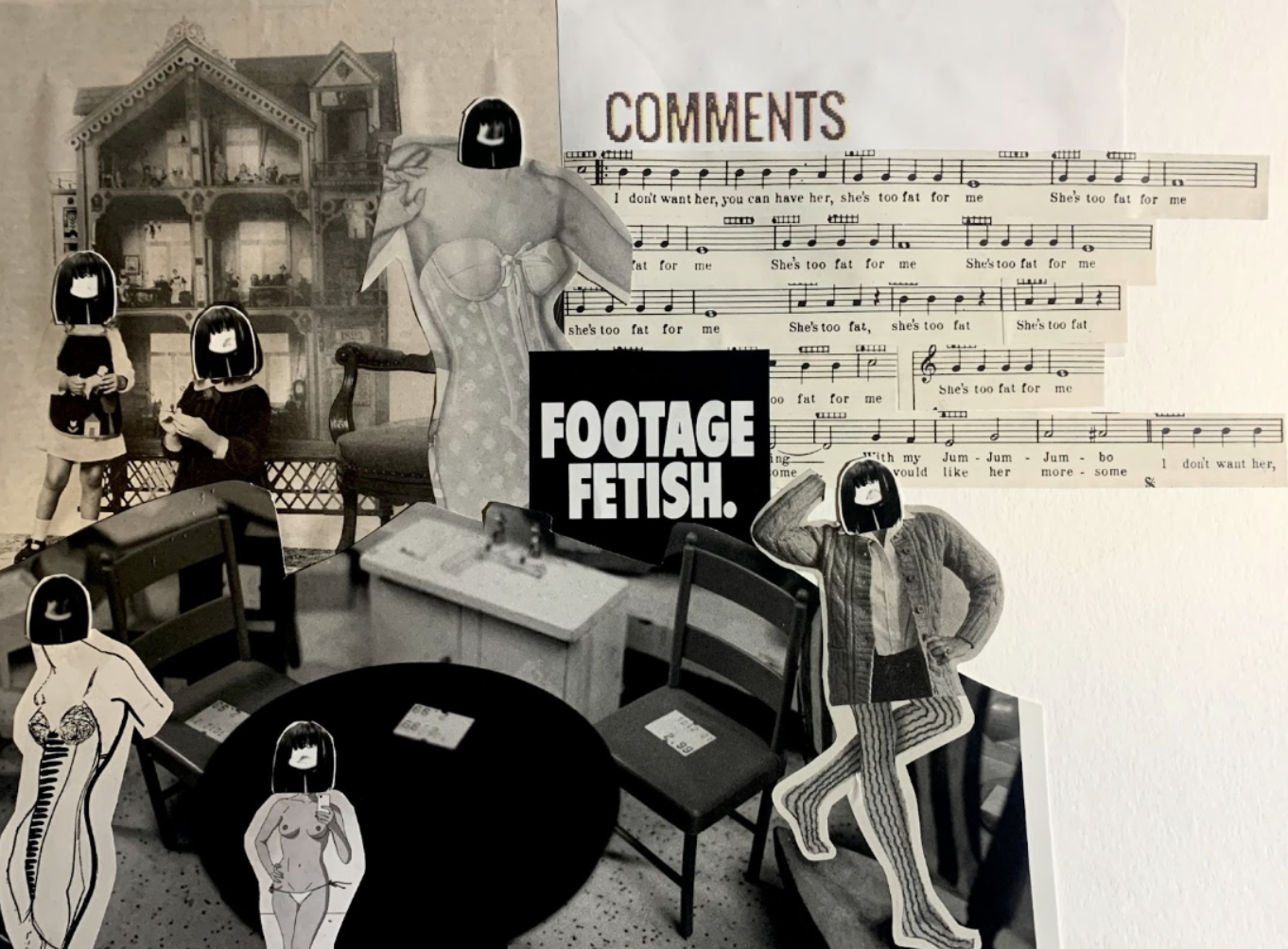Footage Fetish is a combination of film, sheet music, and exaggerated body parts. At Mother of Junk in Williamsburg, the place she credits for a lot of her discoveries, Kate stumbled across an antique dollhouse. She shot the house on 35 millimeter film, then combined it with another set of photos — a halloween wig sitting on a makeup mirror — to create the illusion of people in a living room. “My other projects have been a lot more drawn out and conceptualized,” she explains, “but with this one, I picked up two magazines and sat down, thinking: ‘I need to make something right now.’ It was a frenzy, a 45 minute cutting and gluing moment.” When asked what she hopes people will take away from the piece, she explains that: “I want people to interact with and engage with these works, but I don’t need them to feel the same way I do about it.” It’s one of the things she loves about art — that “there is no right answer.”